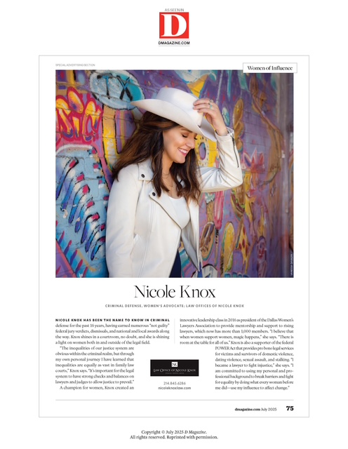 Dallas criminal defense lawyer Nicole Knox has quickly become one of the best criminal attorneys in Dallas and in Texas. She has defended the accused in nearly 100 jury trial verdicts, and she has earned over 60 “not guilty” verdicts. Her dedication to developing a strong defense and to zealous advocacy have also resulted in a long list of dismissals, favorable sentences, and refusals to prosecute.